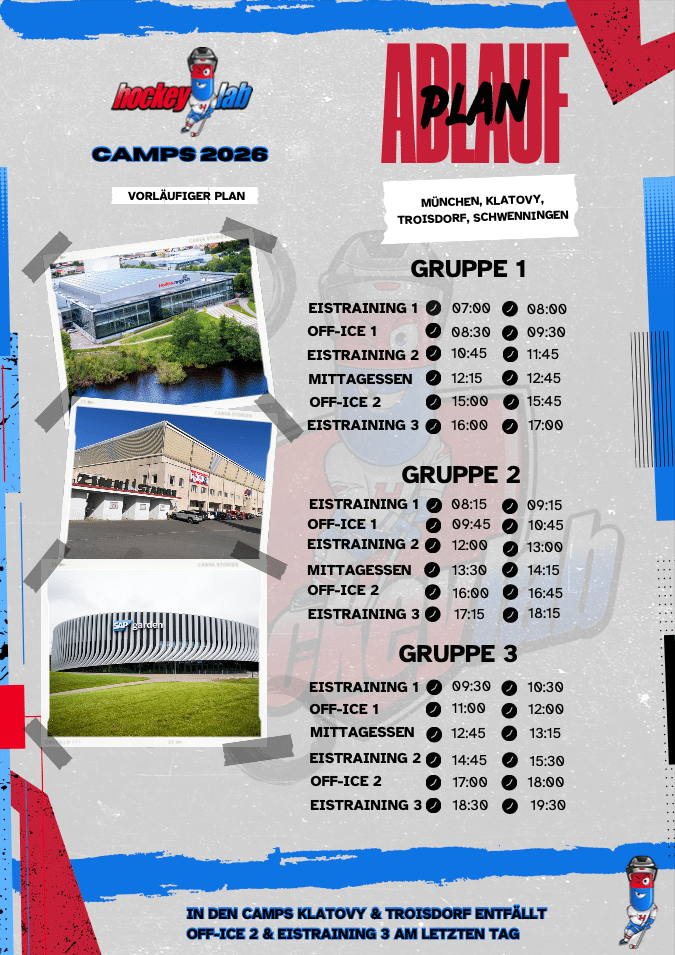 Daneben mitzubringen sind bitte, die komplette Ausrüstung (Halskrause nicht vergessen), 1-2 Schläger für das Eistraining, 1 Schläger für das Trockentraining (darf auf Beton benutzt werden), Sportkleidung für das Off-Ice-Training (Schuhe, Shirt, Hose, Cap), Trinkflasche, Springseil und die Versichertenkarte des Teilnehmers.